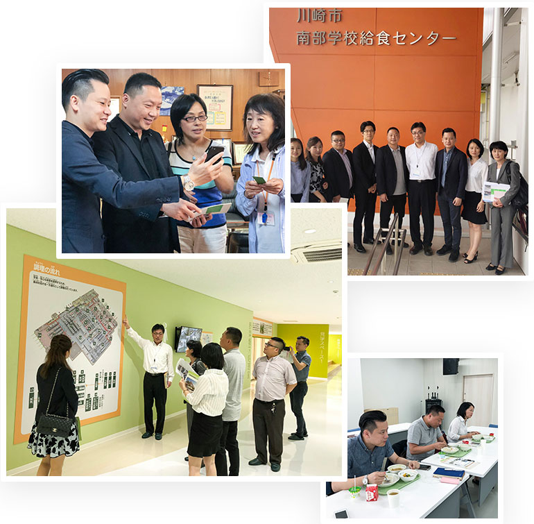 为了提高国内校园供餐水平,培养更专业的服务团队,2018 年一米云站多次赴日本考察校园供餐服务,先后到东京、大 阪的给食中心以及生驹市立一分小学校进行参观考察,在国 际视野下共同交流探讨学校营养餐的经验,实现优势互补、 智慧共享,并获得了扎实有效的经验。为了让中国孩子也可 以吃到像日本一样高标准的校园餐,一米云站决定建立高标 准国际超级厨房。